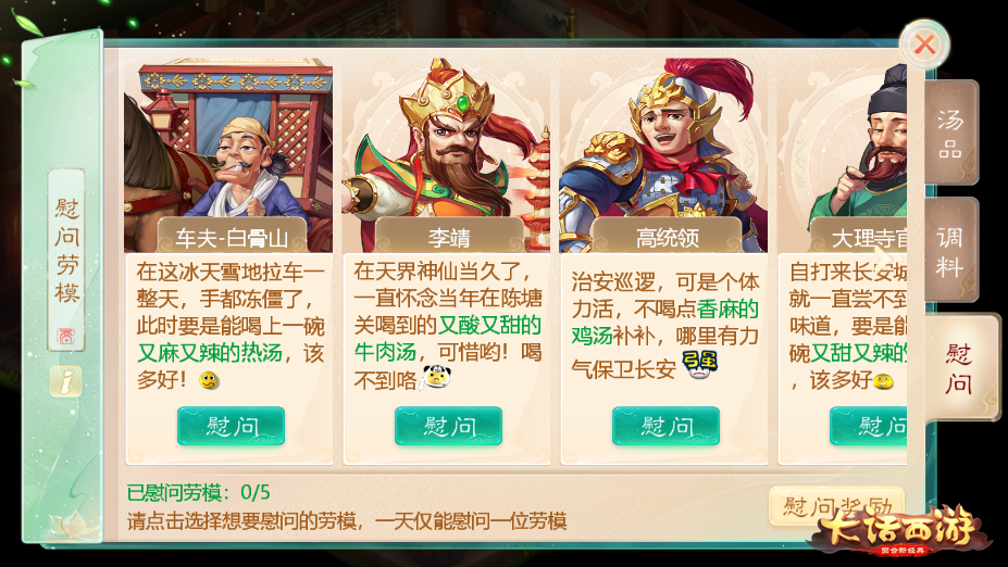 玩家在活动期间,可以将煲好的汤送给五名大话劳模(NPC)进行慰问,在犒赏他们之前,先了解清楚他们偏好的口味,送出相应的汤品就能获得更多的奖励!