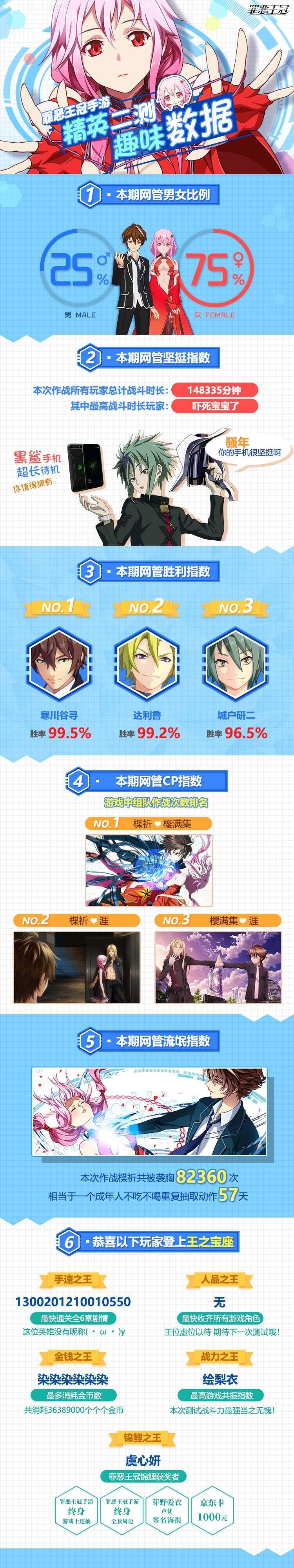 为期8天的测试结束了,感谢各位小伙伴踊跃~~我们这次统计了许多有趣的数据,比如最肝的大佬,最幸运的玩家,某个^&%&的动作进行了多少次,233333,话不多说,看图!