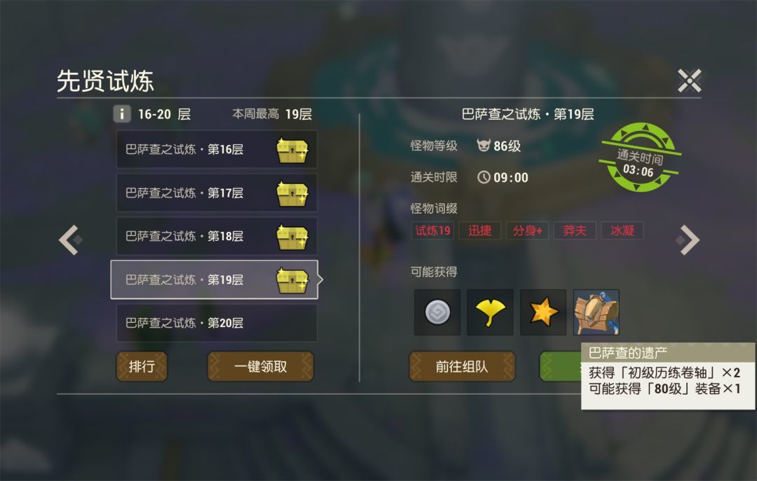 队伍成绩与通关时间有关:每一层试炼的标准通关时间为9分钟;