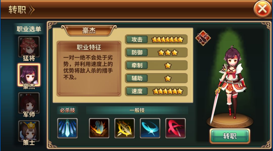 说到物理攻击的兵器,相信大部分穿越者的第一反应都是,剑。我们吞食天地把手持刀剑用剑技杀人的的职业称之为豪杰。豪杰攻击性很强,还有很强的灵活性,一对一绝对不会处于劣势,并利用速度上的优势将敌人杀得措手不及。必杀技“剑意”,吸取百家剑术之精华,融会贯通成一技,刀光剑影之间取敌将首级。如果穿越者很喜欢那种十步杀一人的快感,那么豪杰将会使你的不二之选。