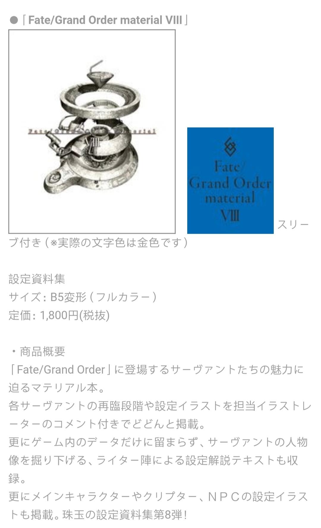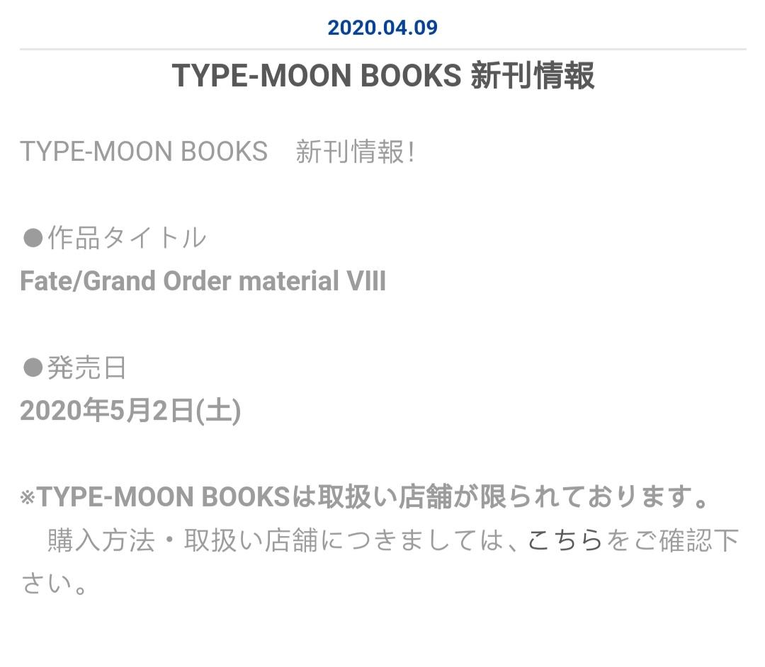 TYPE-MOON BOOKS 新刊情報. 「Fate/Grand Order material Ⅷ」を 「5月2日(土)」に発売します.取扱い店舗にて予約受付中です.よろしくお願いいたします.