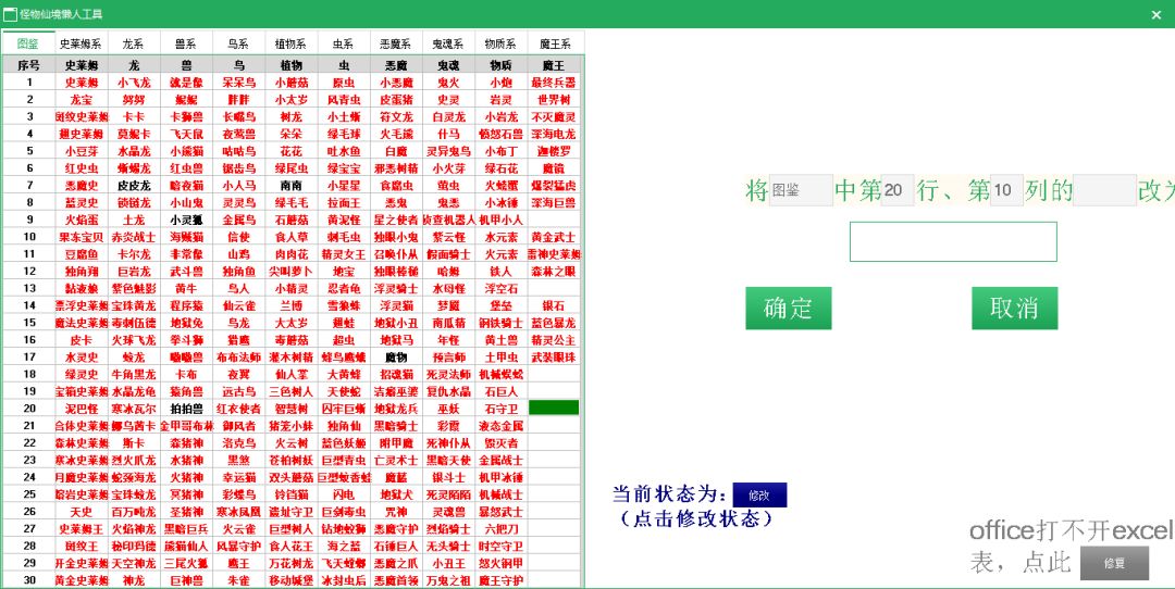 4.修改模式:修改模式下可在图鉴页双击修改和添加怪物名称(与后面的合成页的名称列连锁更改),在合成页双击可修改合成配方和捕捉地图,不可改名称。当然这一切可以不通过软件,直接打开excel,在excel表直接改也可以。