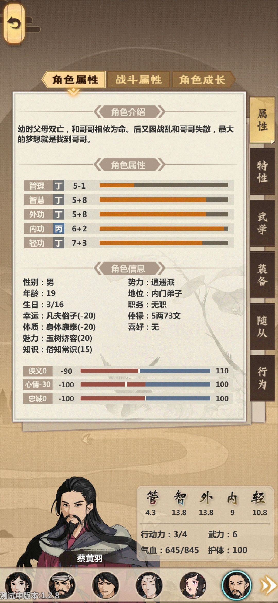 苦命儿,有一个师妹月下相会后来遇难了,被进行人体毒气实验,喜欢去茶楼听书,然后去求个姻缘卦拿着范宁的书就成了,最终形态的红线工具人!