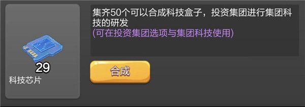 每集齐50碎片可以合成一个科技盒子捐献给集团,每捐献一个科技盒子,可以获取个人贡献值5万。