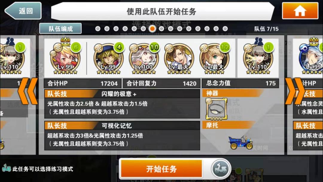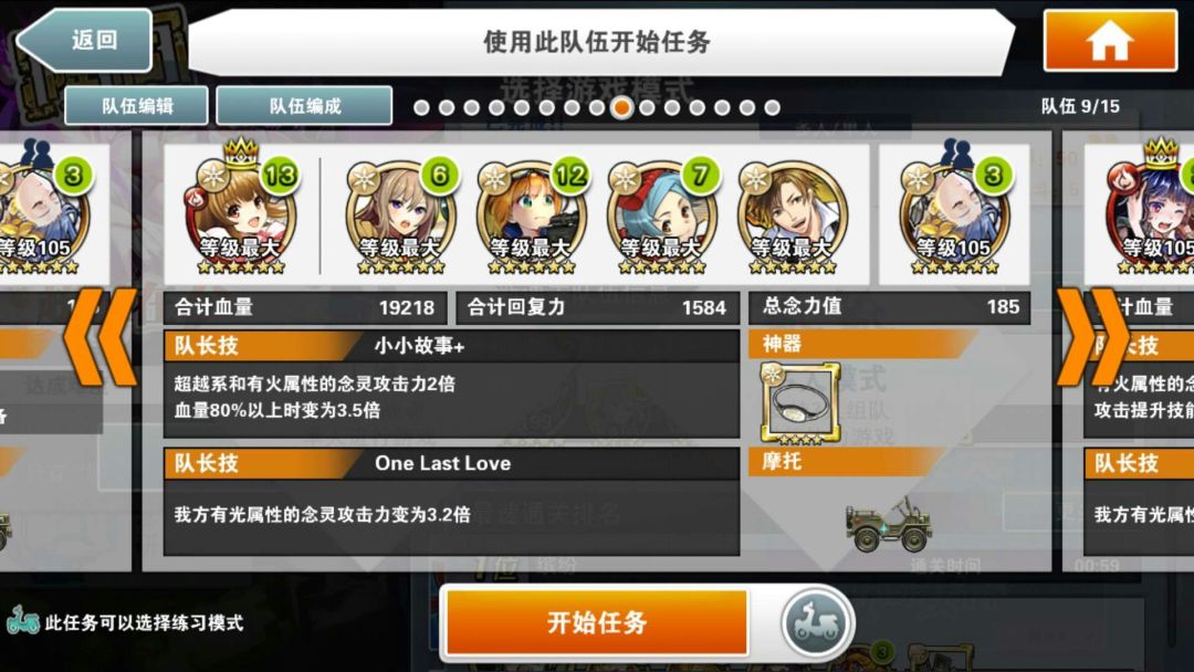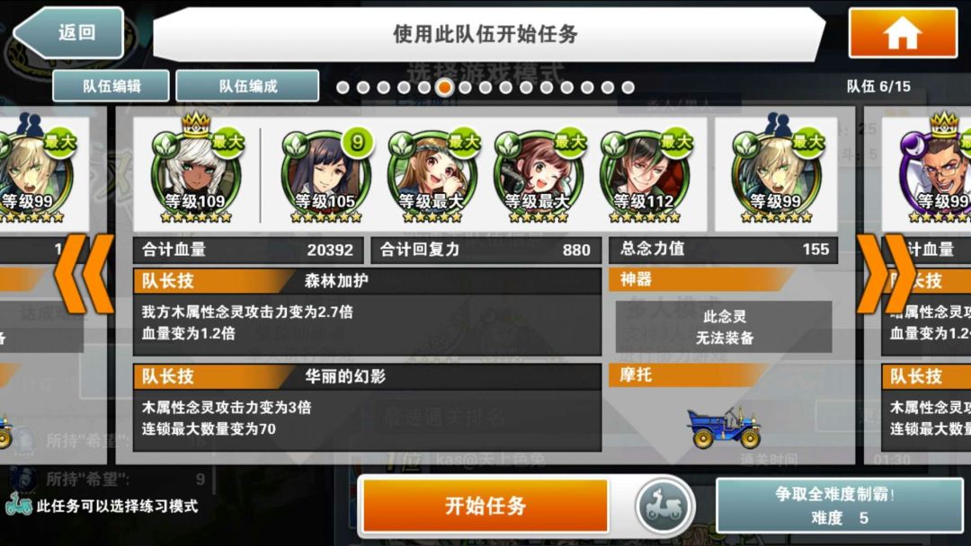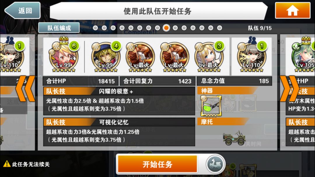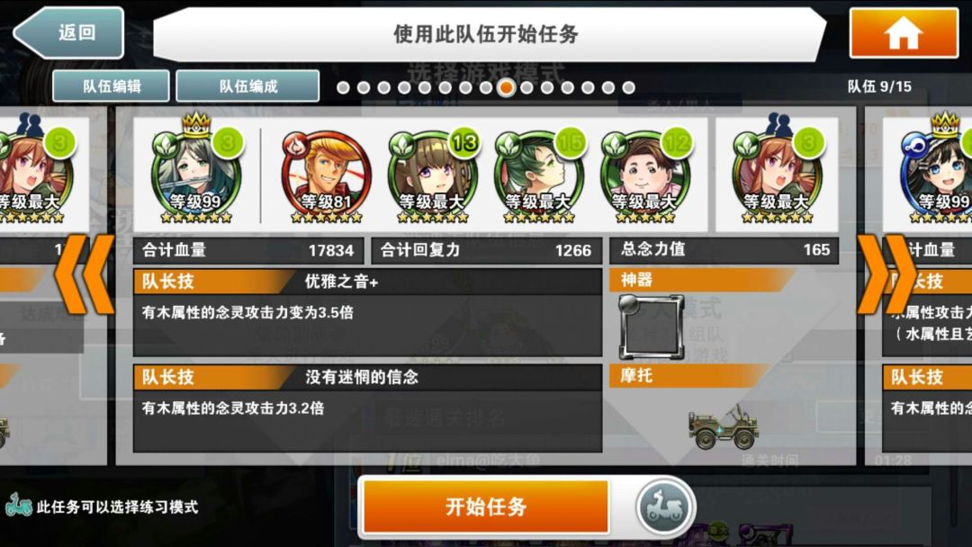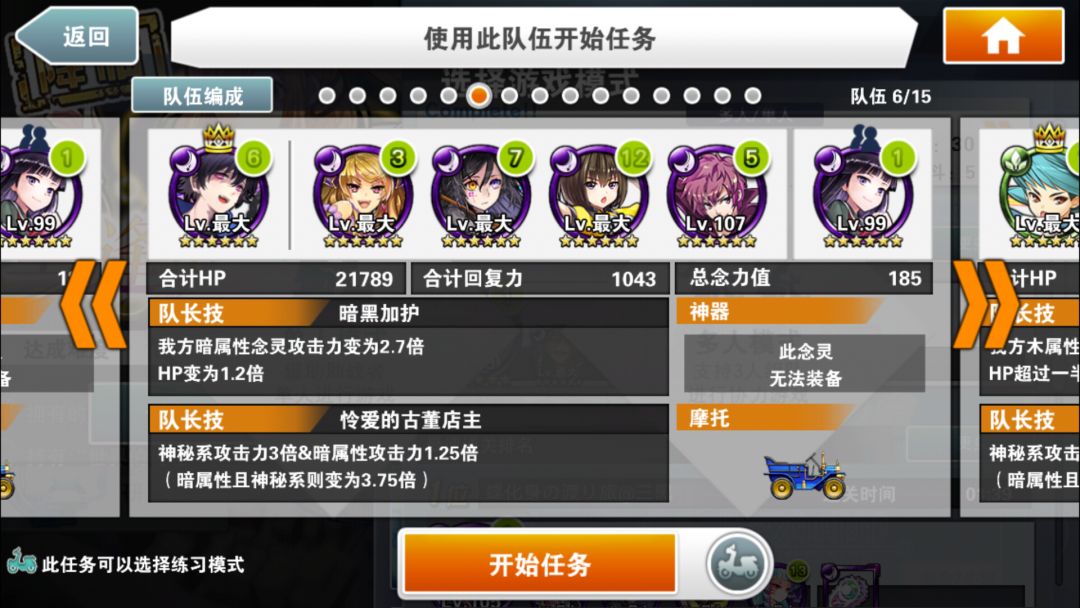 简评:本阵容的核心念灵是好友的小叶子,割血+跳C,既有输出又安全。自己的队长就尽量选高倍率神秘队长。核心思路就是停转飞(时间停止,转换颜色,飞跃一段地形)同时使用,之所以选大咸鱼作为黑飞。主要是除了提供一点可怜的输出外,最主要是两次50%减伤,毕竟用了富二代,本身队伍脆的不行。没啥好特别注意的,停转飞好了一起用收益最大。大咸鱼单用提供免伤也是不错的思路。物理学家姐姐又是奶又是2倍buff。大概在100C结束战斗,没结束也不怕,吃一次攻击再来一次停转飞,就是不缺能量球。