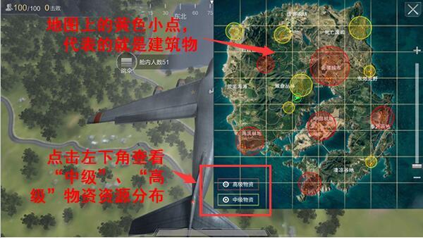 点击右上角的小地图会直接展示全地图,大家可以通过滑动地图或者拉动右侧的滚动条来扩大缩小地图比例,从而更加清晰的分辨房屋的位置与分布,此外大家要学会利用物资分布图来了解物资的具体分布情况。在地图的左下角有“高级物资”与“中级物资”,点击之后地图上会直接展示出高级物资与中级物资的划分区域。
