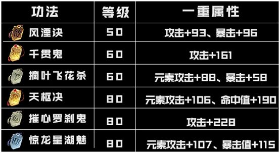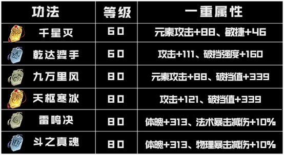 一号斗技位可以使用以下6个功法,增加的是攻击、元素攻击、暴击和命中属性,功法升级为二重之后各项属性还可以增加。