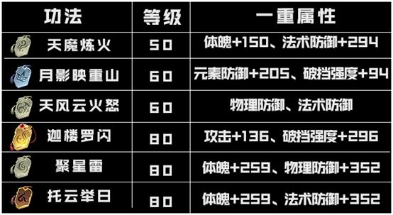 四号位除了迦楼罗闪之外都是防御类功法,提供了元素防御、物理防御和法术防御,增强自身防御可以有效避免被敌方瞬秒,增加存活几率哦~