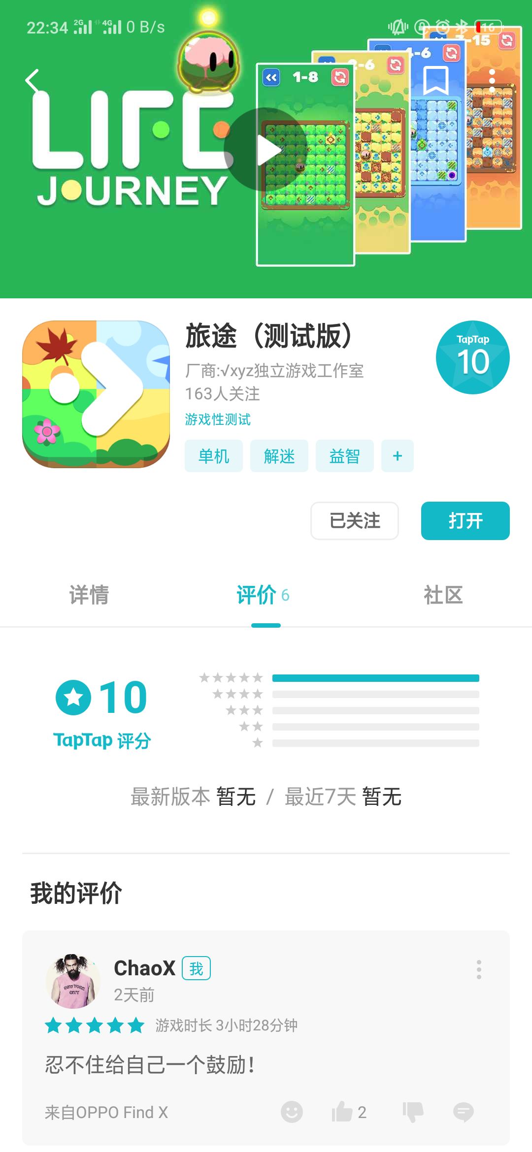 终于在得到了6条评论之后,显示出了分数。得到了一部分玩家的鼓励,得到了一部分玩家的夸奖,尤其当我听到玩家玩到了3-19的时候(一共4-30,120个关卡)心里很感动,有玩家是真的认可了我们的游戏,玩到了比较后面。如果有机会继续以根号xyz的名称做游戏,我还希望能做出有趣的游戏,这真的是我最喜欢的事。
