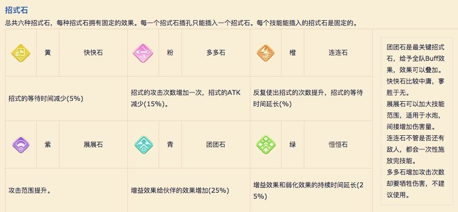 每种宝可梦,都有不同的招式池,成为伙伴时,随机从招式池选取1至2个招式。单招式宝可梦拥有3个招式石插孔。双招式宝可梦,单招式可拥有0-2个招式石插孔。每个招式对应的招式石插孔,允许装备的招式石是固定的。