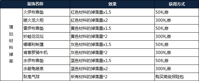 3.建议初始先购买50点券的各色材料掉落提升,性价比最高。其次中期增加蓝色材料掉率和提升特训成功率的装饰性价比最高;
