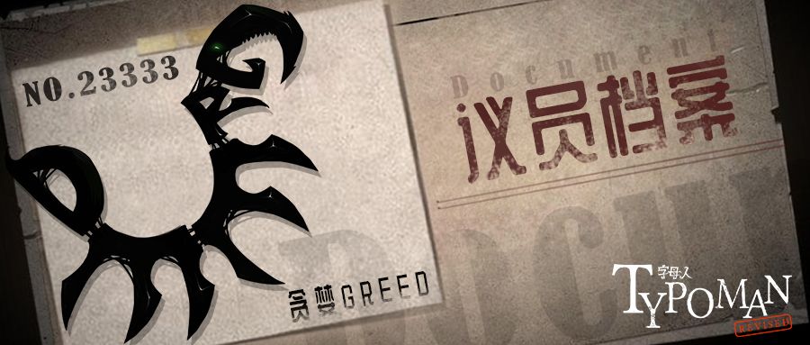 今天是个好日子,我们迎来了一位蝎子状的巨型怪兽,他是字母世界最凶猛狡猾的捕食者,也是圆桌会议攻击力最强的议员之一——贪婪GREED。