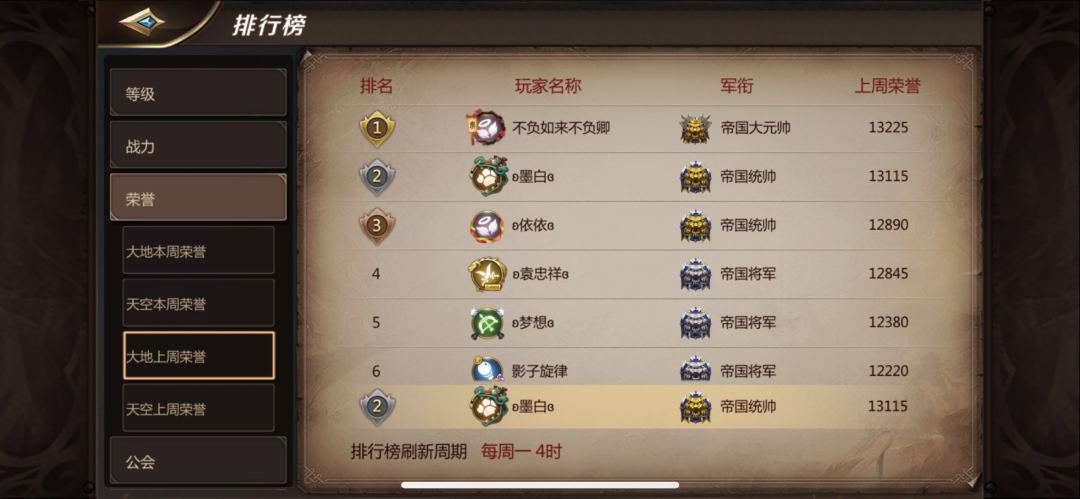 军衔系统上线已经快要一个月了经过一周的摸索和两周的持续打榜最终成绩为第一周第二名帝国统帅和第二周帝国将军(由于周四更新后调整高阶军阶荣誉获取难度所以第二周成绩不理想,关于高阶军衔荣誉获取下面会详细论述)