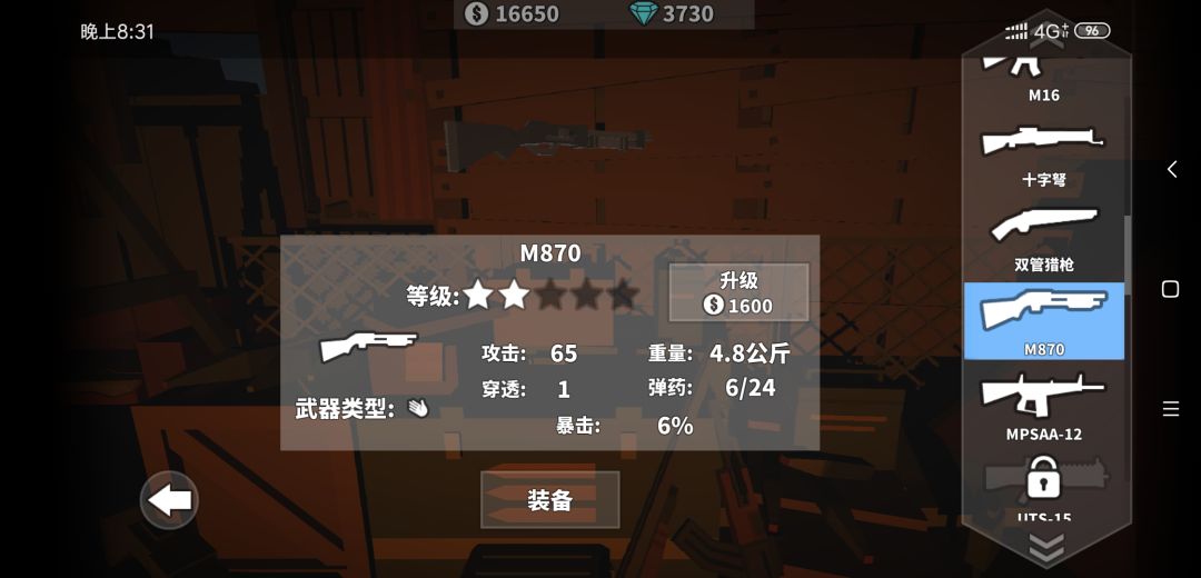 M870,一把憨批散弹,威力确实可观,可是他的地位就和M4差不多,比双管好,可是比不过AA12(这个后面讲)自身优点就是威力较大,弹片范围广。