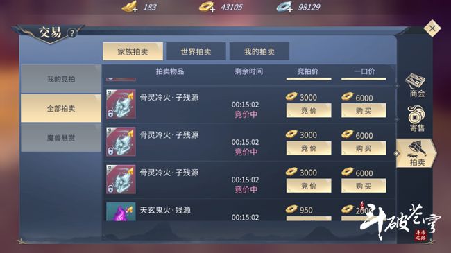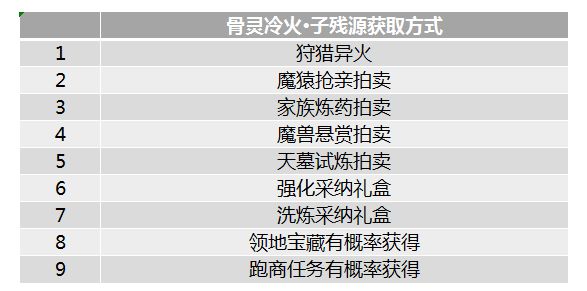 骨灵冷火·子残源目前最主要的获取方式就是狩猎异火与家族拍卖。魔兽悬赏、家族炼药以及魔猿抢亲活动结束后的拍卖会出现骨灵冷火·子残源,家族炼药以及魔猿抢亲活动结束后会有家族评价,家族评价越高,残源的数量越多。