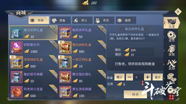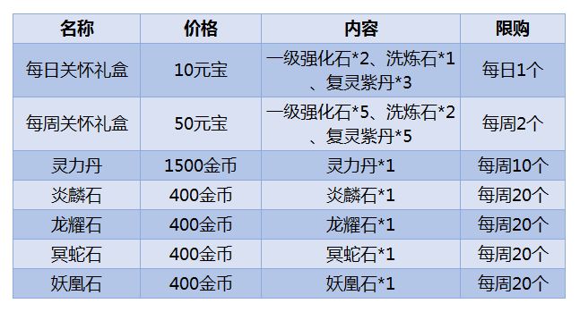 元宝商城中道具建议大家购买10元宝每日关怀礼盒(开启后必得一级强化石*2、洗炼石*1、复灵紫丹*3),以及50元宝的每周关怀礼盒(开启后必得一级强化石*5、洗炼石*2、复灵紫丹*5),分别为每日限购1个和每周限购1个。这两种宝箱是元宝商城中最超值的道具,一个洗炼石就需要40元宝,如此对比是不是很划算呢?