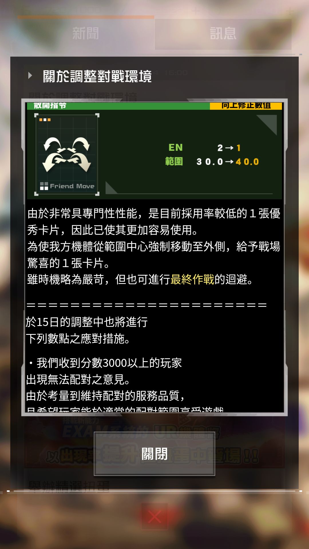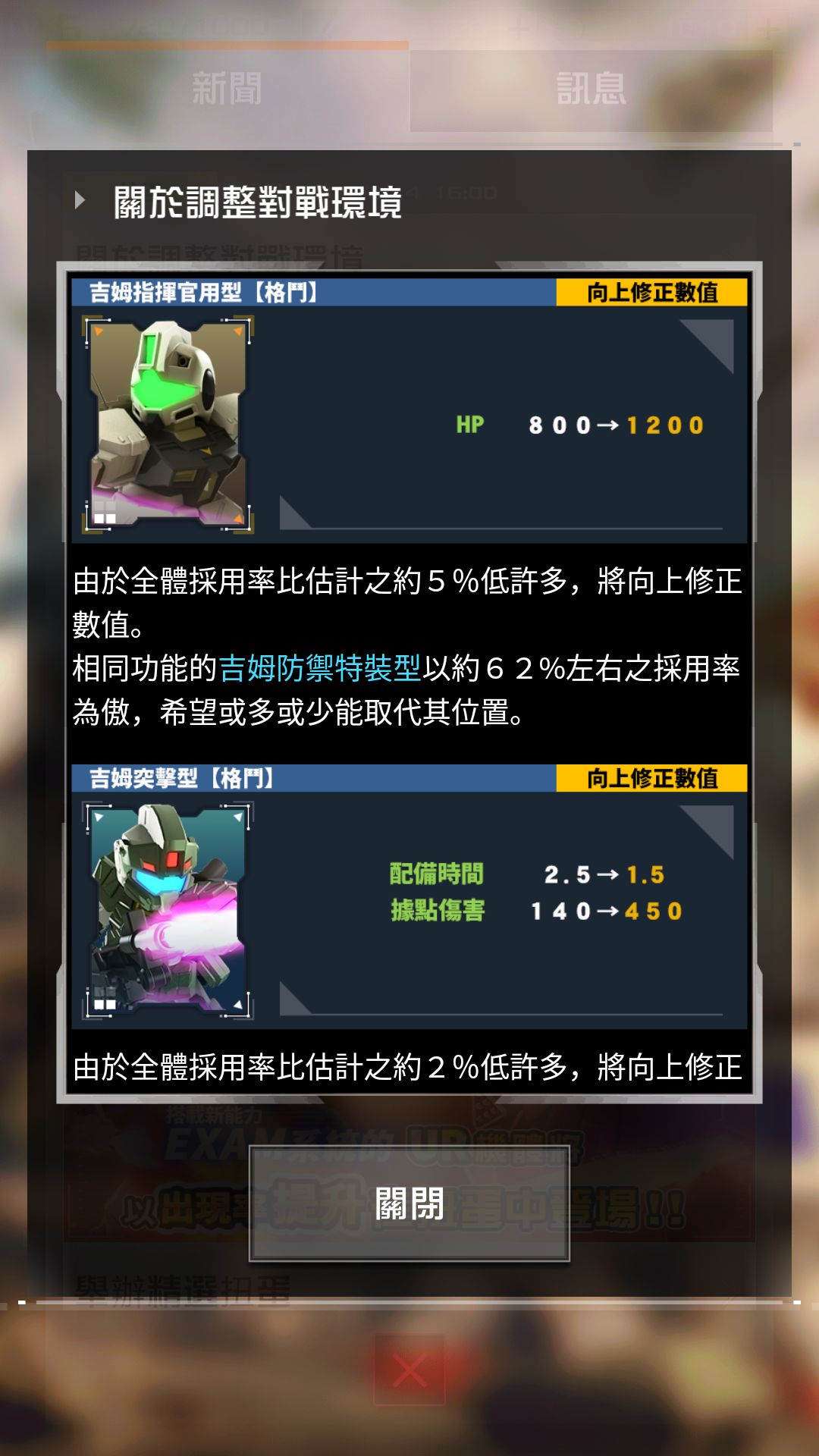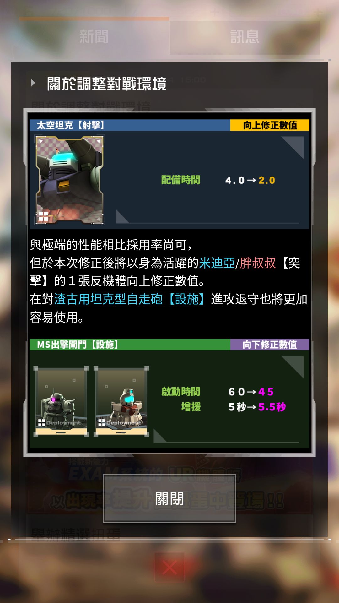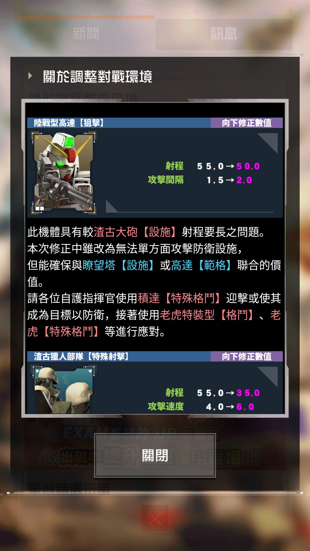 首先需要注意的是联邦两个性价比较高的强势机体被削弱,原来的一些打法和套路必须作出对应的改变,首先是狙击陆高和扎古猎人部队的射程下降,不能再愉快地在塔外打墙了,扎古猎人部队大削,除了射程配备时间和攻速也减慢不少,看得出来将更变得更偏向于辅助和防御位置