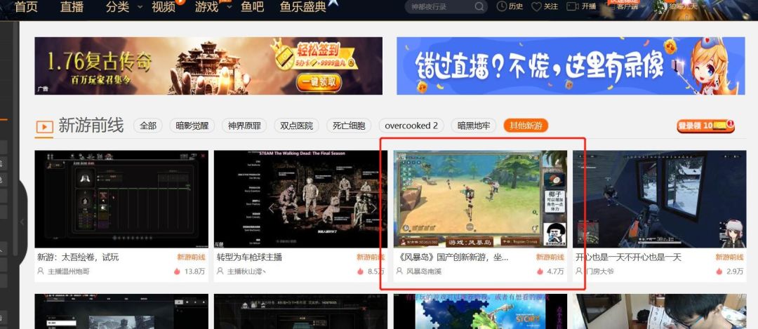 风暴岛在开测第一天就登上了斗鱼的新游首页: