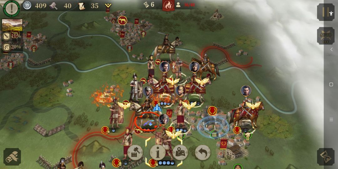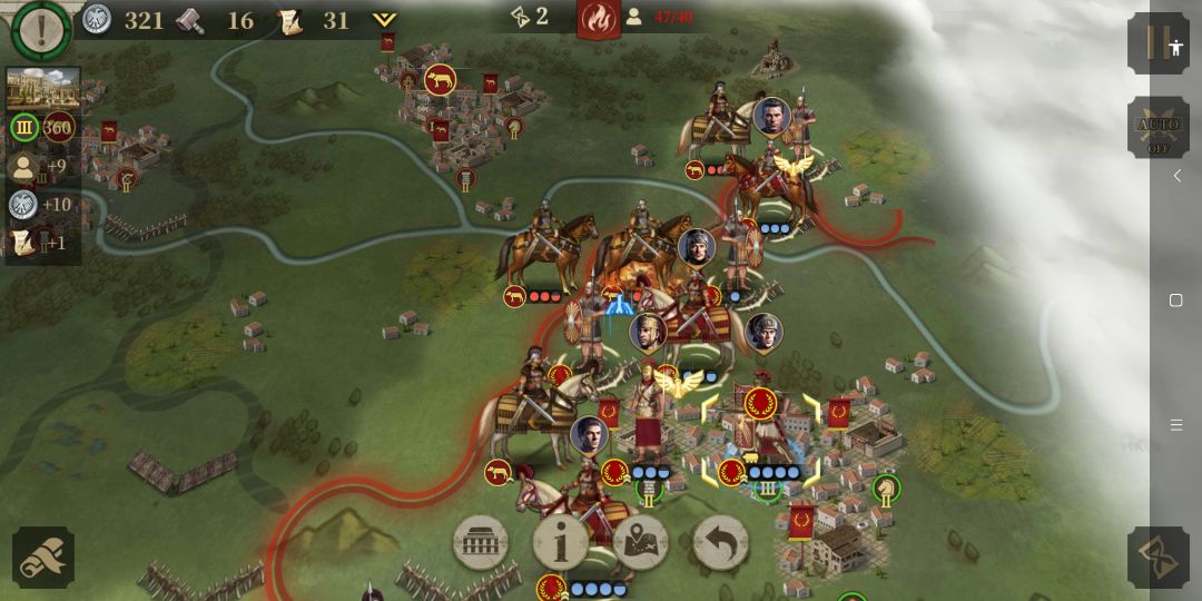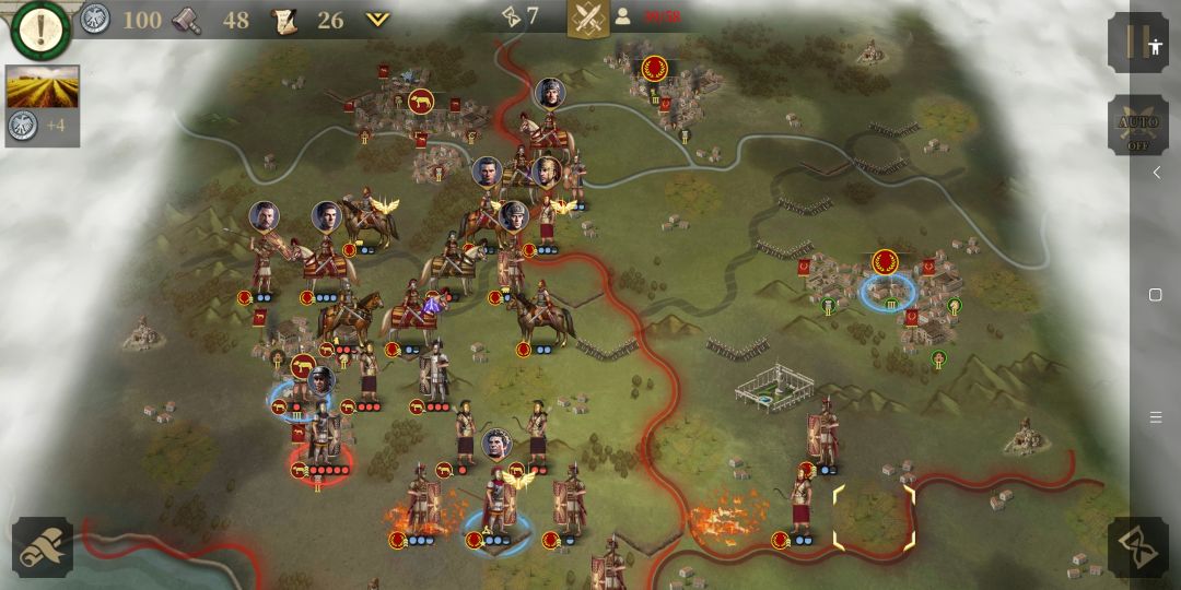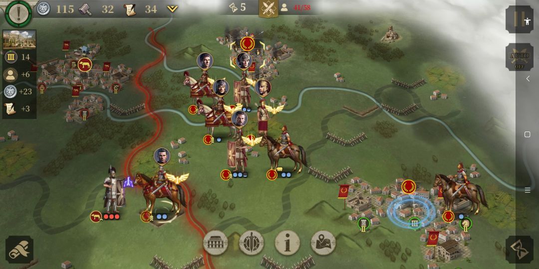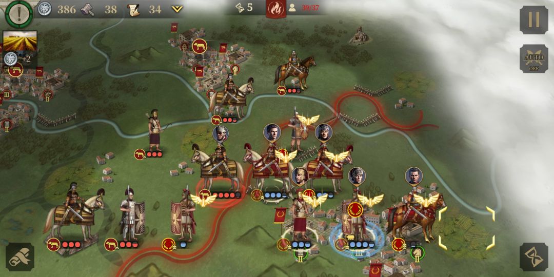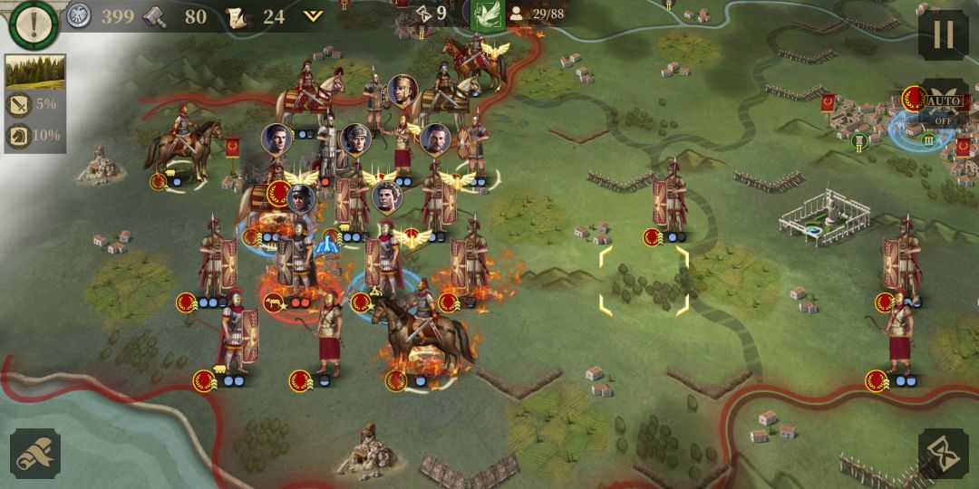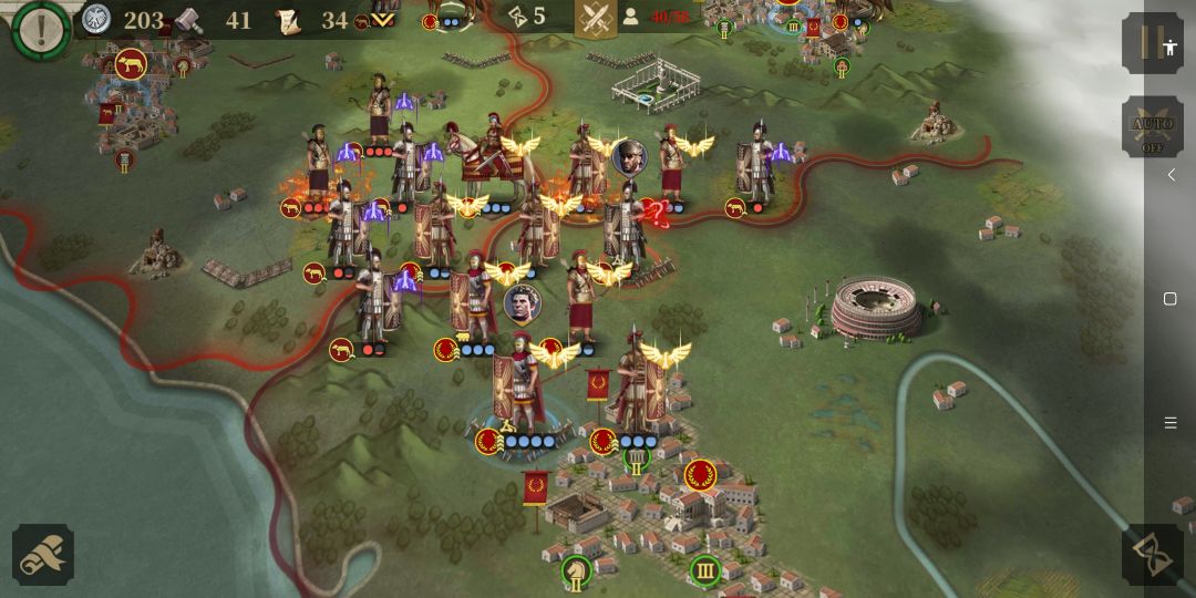 与此同时,正面凯撒的重步军团与庞培阵列交战 。虽然作战经验不如凯撒的士兵(如图:很细节,庞培的重步军团除将领以外其余没有经验,凯撒一方的重步显然有不错的军团等级)但是凭借数量优势在正面稳住了阵脚。