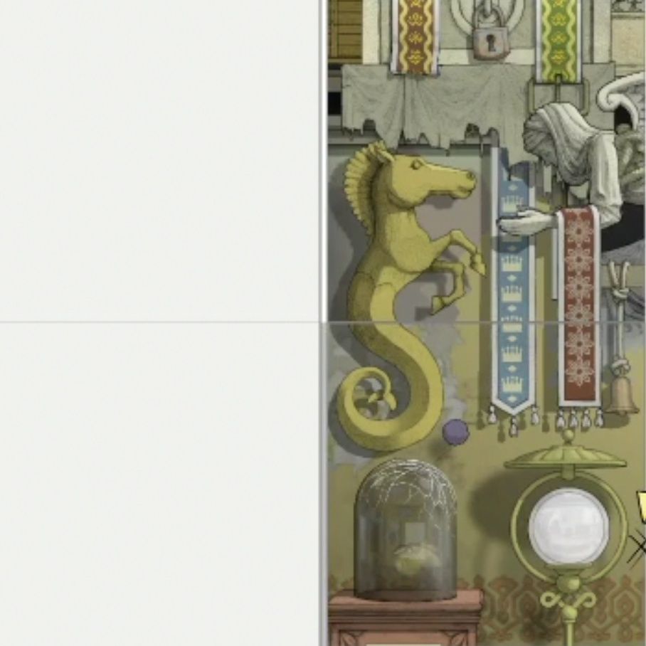 文字解说:【1】书架上的书/箱子?、两个图拼在一起变成一个小天秤,左右倾斜使灯和窗外的星星分别在不同的画面里,然后拼合图像点亮灯。