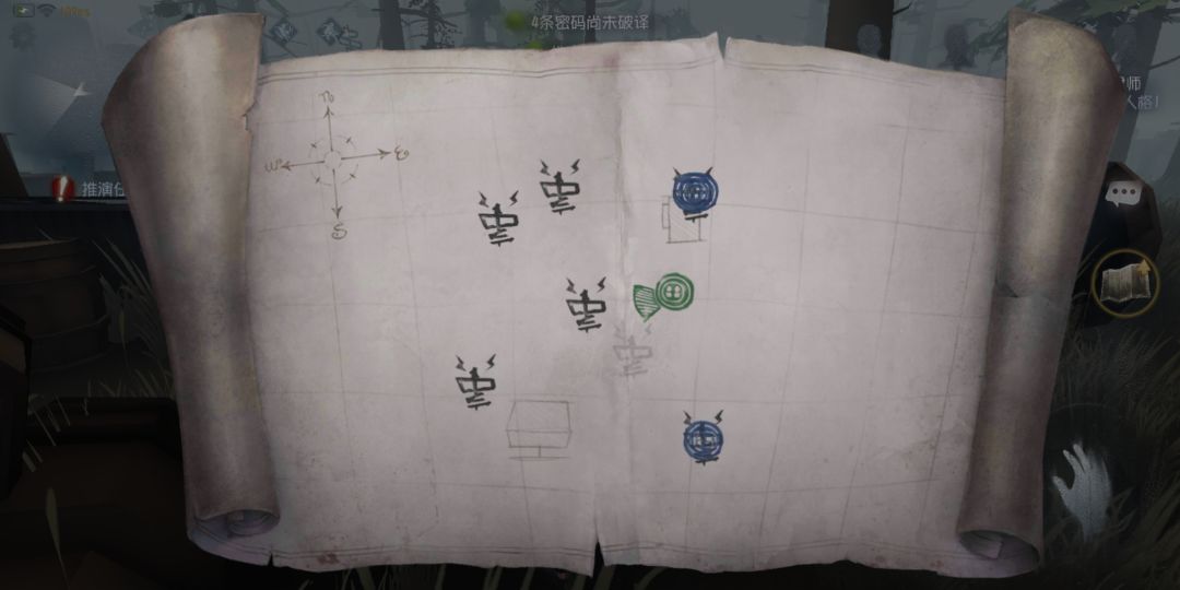 图六(绿色圈是你的位置,多出来的小绿块显示你的正对方位,蓝色是你的队友所在,当监管打到队友或者绑人时也会在地图上以红色显示出来)