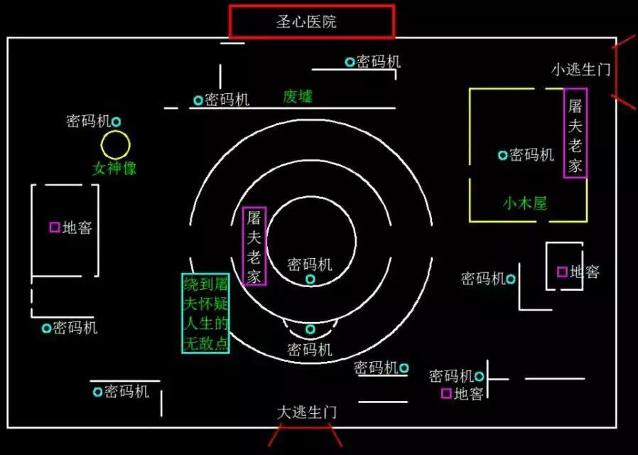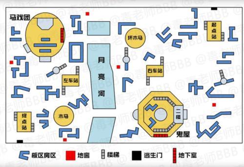25:如果你想要溜屠夫,那么一定要记住地图里哪里有什么东西,至少有个大概印象。有的地方叫无敌点,意思就是可以无限绕在这个地方溜屠夫,比如工厂的大小木屋,医院的一楼二楼和木屋,教堂大门口左边的木板和那个窗户构成的一个长条结构还有木屋,湖景村的大船上下。更多的时候你不一定在无敌点,有的地方板子放完就得跑,那就需要来回的在多个板区移动,不停地转点来溜屠夫,当然最重要的是控制和屠夫之间的距离,不能过近。这就需要对地图有一定的了解,怎么来衔接各个板区。这下面是我收集的几张图,如果想练溜屠夫的话,可以在游戏里自定义去比对地图的各个位置,并且去找人机屠夫让他追你,反复磨练,最后成为人皇~