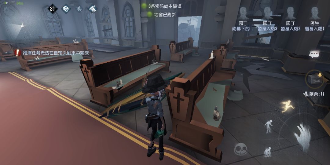 调香师的三瓶香水可以完美躲三次屠夫的攻击,加上一些板子前后放分身的技巧和上下楼的地形更是好用几乎连抽刀都不怕,没有魔术师的震慑让她成为一流的溜鬼位。