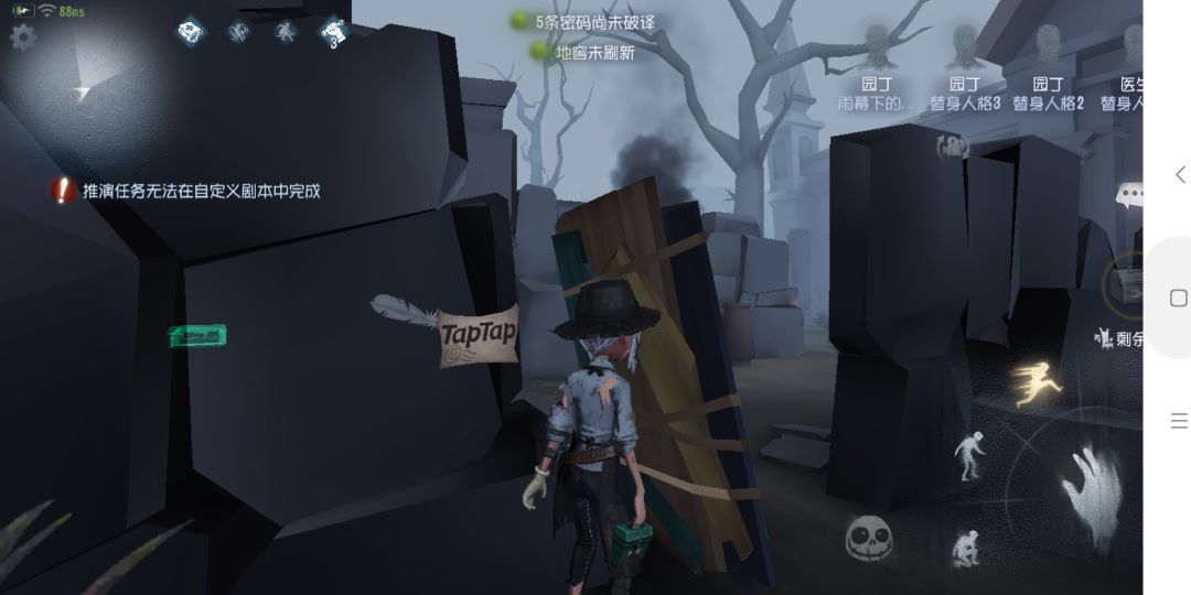 24:地图里设置了很多板子,但是板子和板子是不同的,有的板你可以站在板子后面的缝隙里。这样的俗称安全板,很容易砸晕屠夫。屠夫无法出刀直接打到你,不果屠夫也有一种技巧对付这种板,会蓄力进入滑步状态快速过板并且快速转视角打你,这就看谁手更快了。