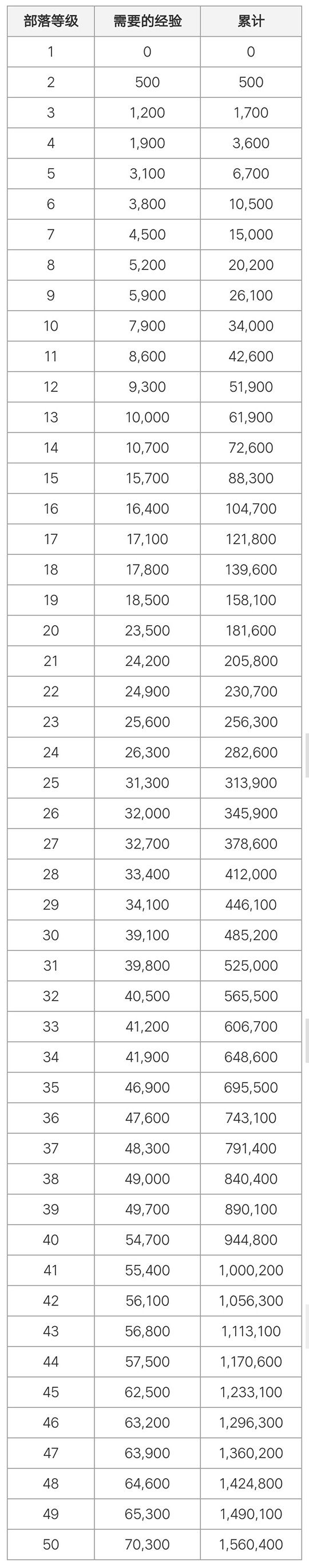 部落各等级需要的经验