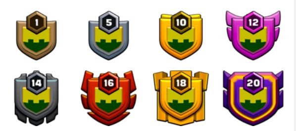以下列出1到20级部落的徽章变化,徽章太多不一一列举,这里只是其中的一个种徽章。部落徽章的图来自:Clan Badge | Clash of Clans Wiki | Fandom