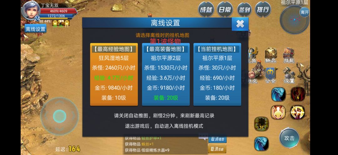 3.挂机部分介绍。可以选择经验优先,和装备优先,x-5是经验最多的关,这也导致了大多数情况离线比在线收益高。手机码字,图放到后面,大家可以看下区别。