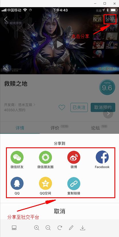 ①在“救赎之地”详情页面(传送门:https://www.taptap.com/app/133713)点击右上角“分享”至微信朋友圈、微博、QQ空间、等社交平台。