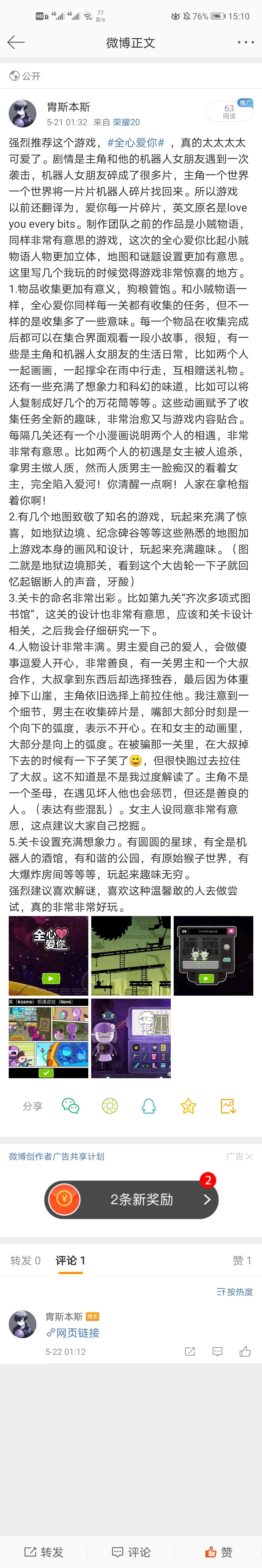 我并不缺那一点点钱,我是真心喜欢这个游戏,我在游戏里面看见了主创团队的用心,看见了游戏的温馨。我希望我带着对游戏的喜爱写下的东西可以被认可。但是,确实被其他人认可了,可官方却觉得不如一句话。