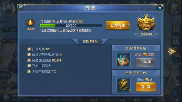 在游戏前期,许多建筑物例如农田、伐木场、行军营等建筑,它们的升级时间都是较短的,为了避免等待,但是有不想花费高昂的钻石去缩短等待时间的话,那就充值适当的金额提升贵族等级,首冲6元即可成功贵族1,还能获得一个橙色英雄,不但提升了战斗力,还可以增加免费加速的时间,是前期发展抢先一步的重要因素。
