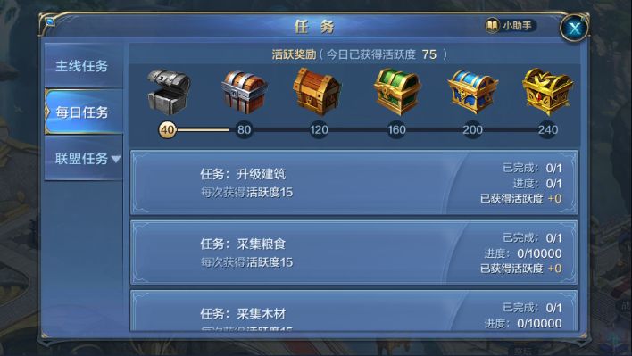 在游戏界面的左下方有一个任务图标,包含主线任务、每日任务和联盟任务,其中每日任务完成后会获得相应的活跃度,活跃度达到一定的数量能够开启活跃宝箱,宝箱内的物品丰富,包含资源、领主经验、道具以及钻石!联盟任务也有相应的宝箱,完成相应的联盟任务可开启,获得相应的道具。所以主君一定要合理进行每日任务,争取每天都领取完活跃宝箱,对城堡的发展可是至关重要的哦~联盟任务是以周为单位的~可以合理分配时间去完成。