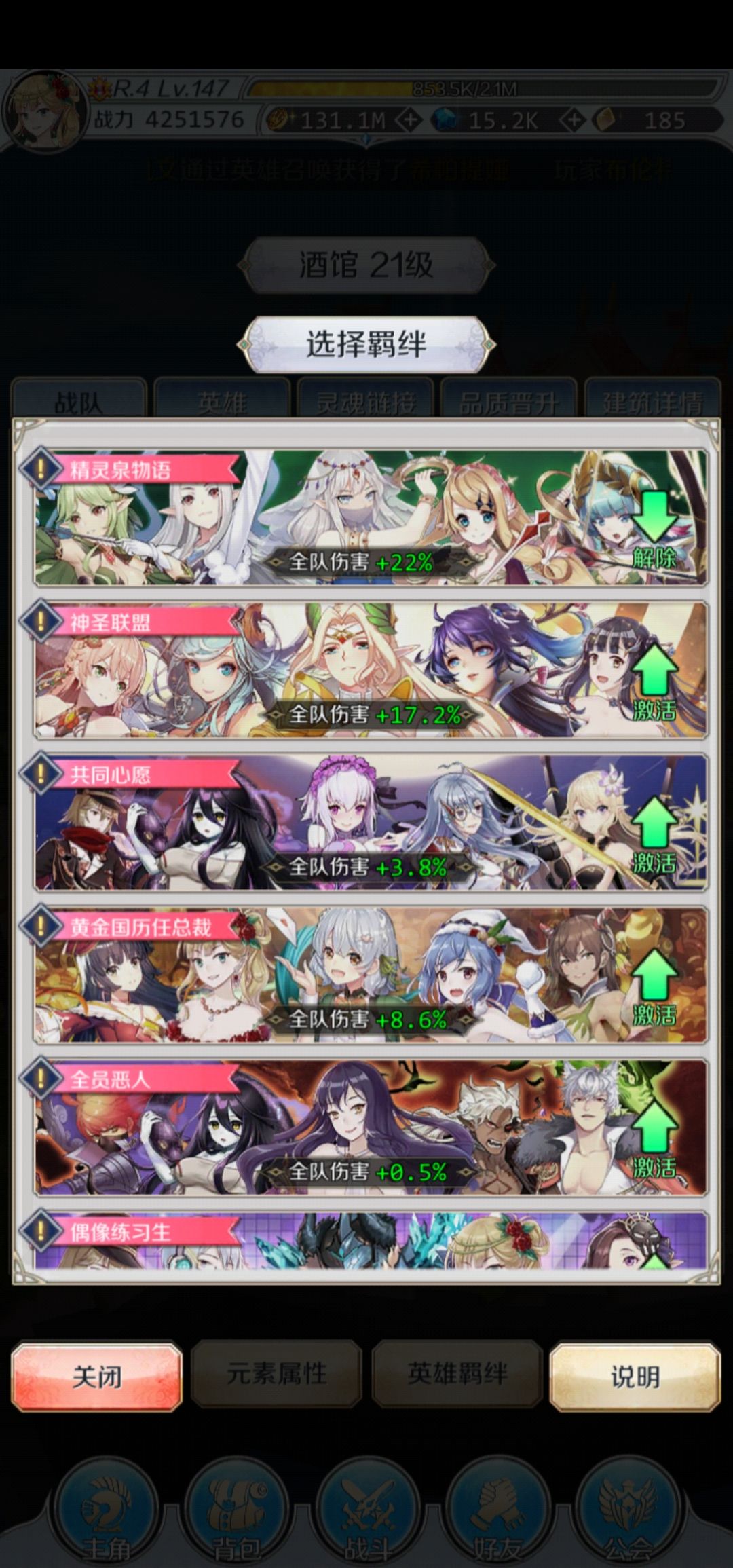首先 羁绊系统是你可以随便挑选 随时回退 不用担心选错了回不了头 属性加成是完全增加输出 数值等级跟你总品质有关 ssr是5 每晋级一次加一 炫彩加是16 五个英雄最多80 可以达到64.8%的增伤