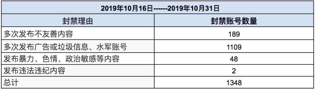 十月下半月禁封账号总量为1348,相较于上期总量小幅减少,除了依旧保持对水军的惩处外,由于近期清查时政敏感内容,因发布敏感涉政内容而被永久封禁的账号数量有较明显增长。