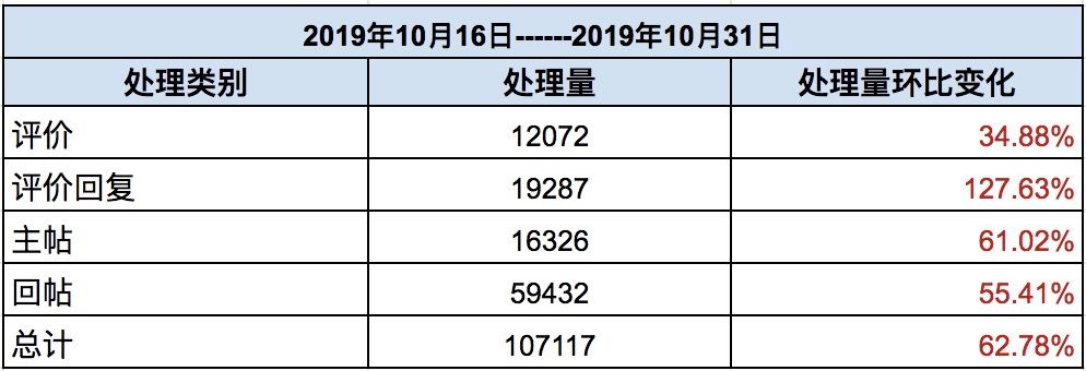 十月下半月内容处理量为107117条,平均每日处理内容7141.1条,本期内容处理量大幅上涨,其中评价回复类增长一倍多,近期多款新游上线,玩家们讨论火爆也是情理之中,但小管家提醒各位Taper请一定要理智讨论,友好交流哦~