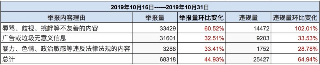 十月后两周社区总举报量为68318条,同比增加44.93%;实际处理量25427条,同比增加64.94%,举报核实处理率37.22%。举报核实处理率有点明显的5%的增长,同时总举报量也涨幅明显,评价类举报涨幅突出,可以看出各位Taper积极的举报以及对于TapTap管理团队的信任。