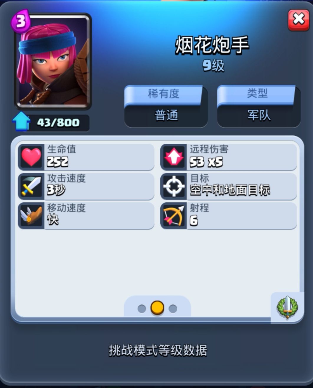 卡片稀有度:普通卡类型:军队以下解析均为9级为准 血量:252法术牌对阵:小电电不死 滚木滚不死 毒药4.9秒毒死万剑扫的死 雪球砸不死 冰冻冻不死 大电可以电死(电不死要逆天了) 地震震不死 火箭可以砸死(砸不死逆天) 总结:只有万剑最适合解其次毒药火箭大电不推荐敌方有其他我单位时可以考虑射程 :6与火枪手一样与其他卡牌对比射程中规中矩,操作失误会激活对面国王塔放置位置需谨慎攻击速度3秒属于蓄力攻击所以攻速比较慢比大部分卡牌慢比电磁炮快一秒下图为面板值