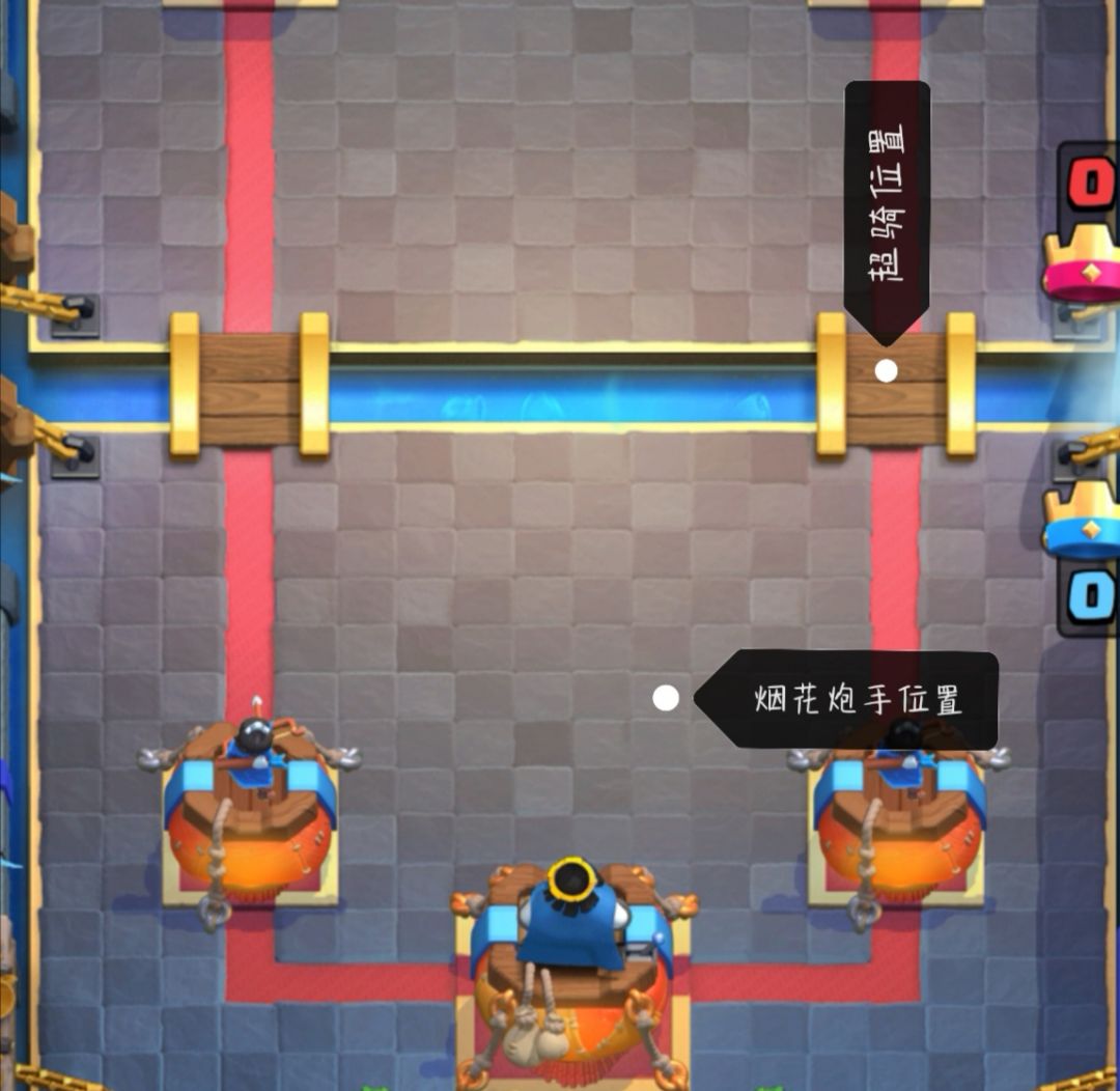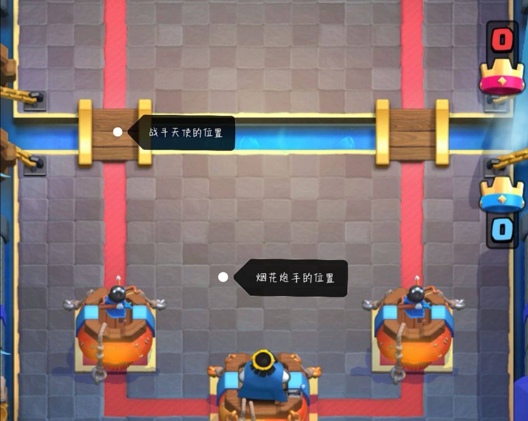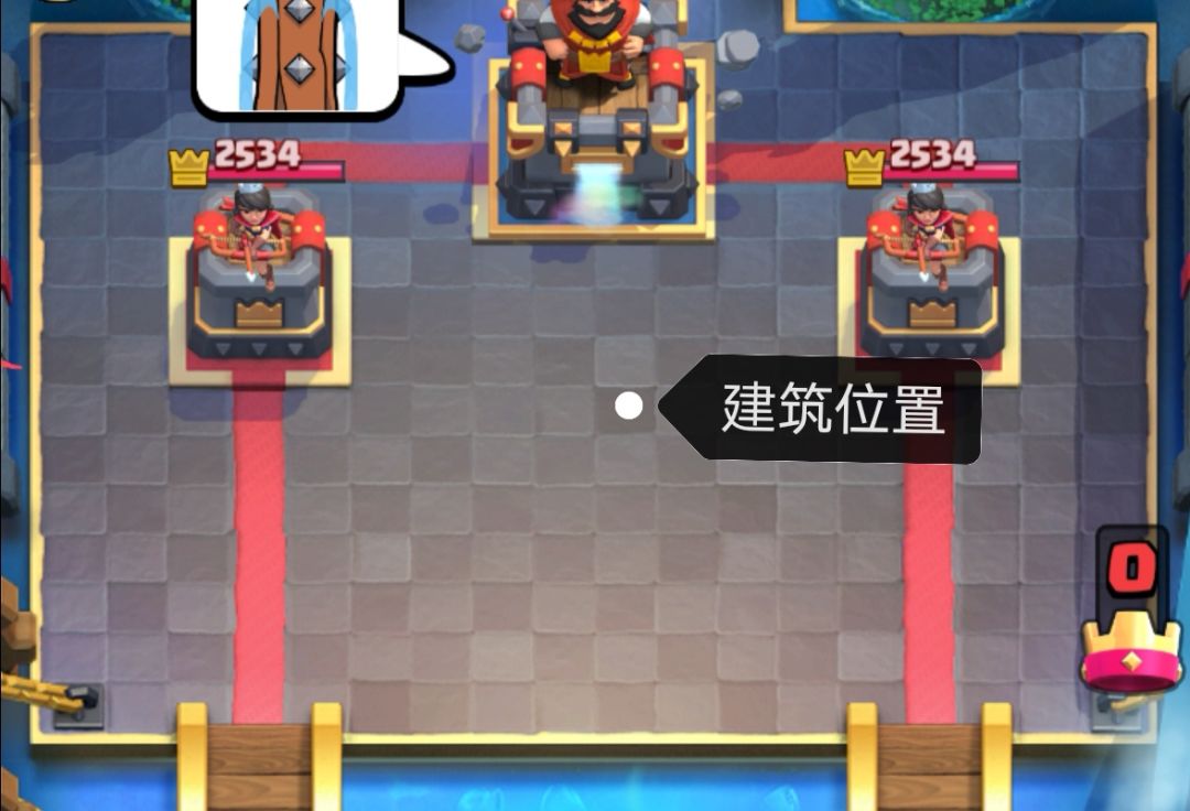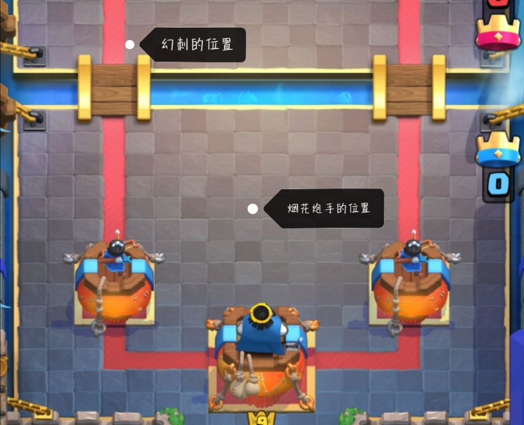 现在给大家讲讲她的缺点如果对面有建筑物下图位置烟花炮手攻击建筑时是不会激活国王塔(在国王塔前面3格位置)少于3格会激活国王塔