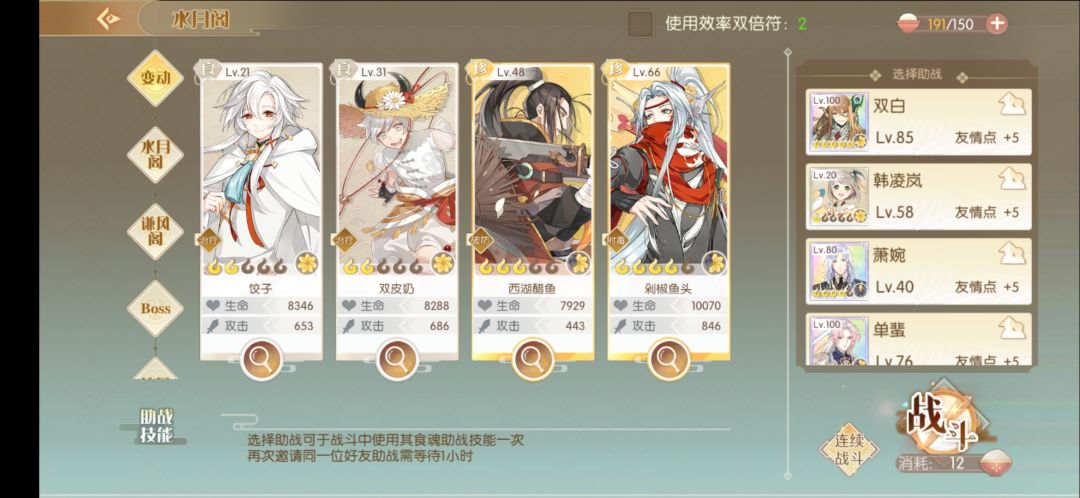 队伍中不使用御和限定,全程不复活通关水月阁·八