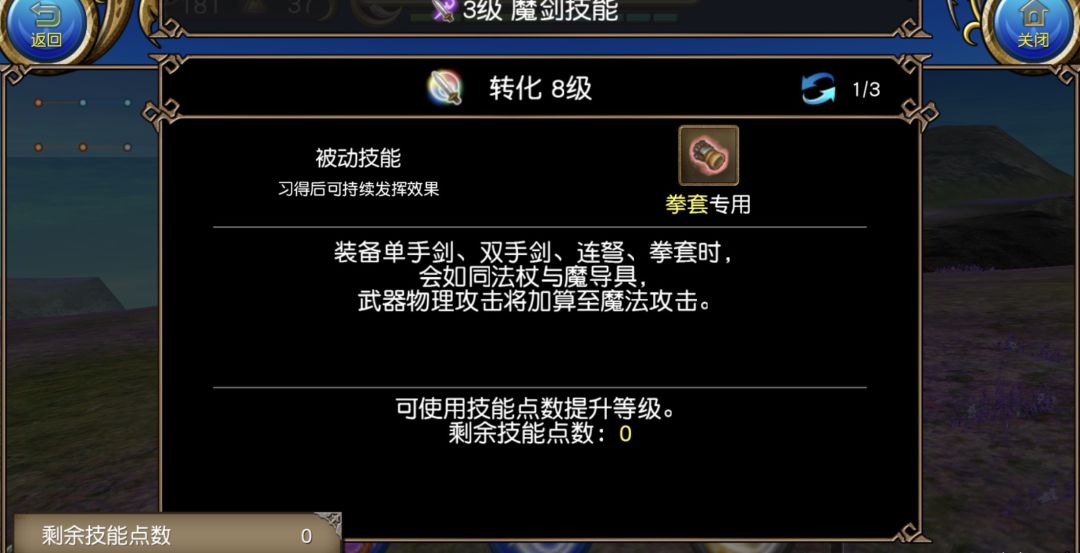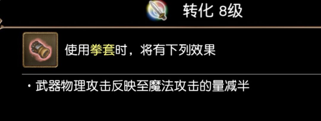 首先来明确一点,转换是把武器物理攻击转换成魔攻而不是物理攻击转换成魔攻,也就是吃精炼和武器本身面板,大家看到拳套收益减半这里可能心里就凉了一半,但是在这个技能没改善之前,拳套仍然可以转换一半的武器物理攻击(算入精炼)转换成魔攻(其他武器能不能我不知道)