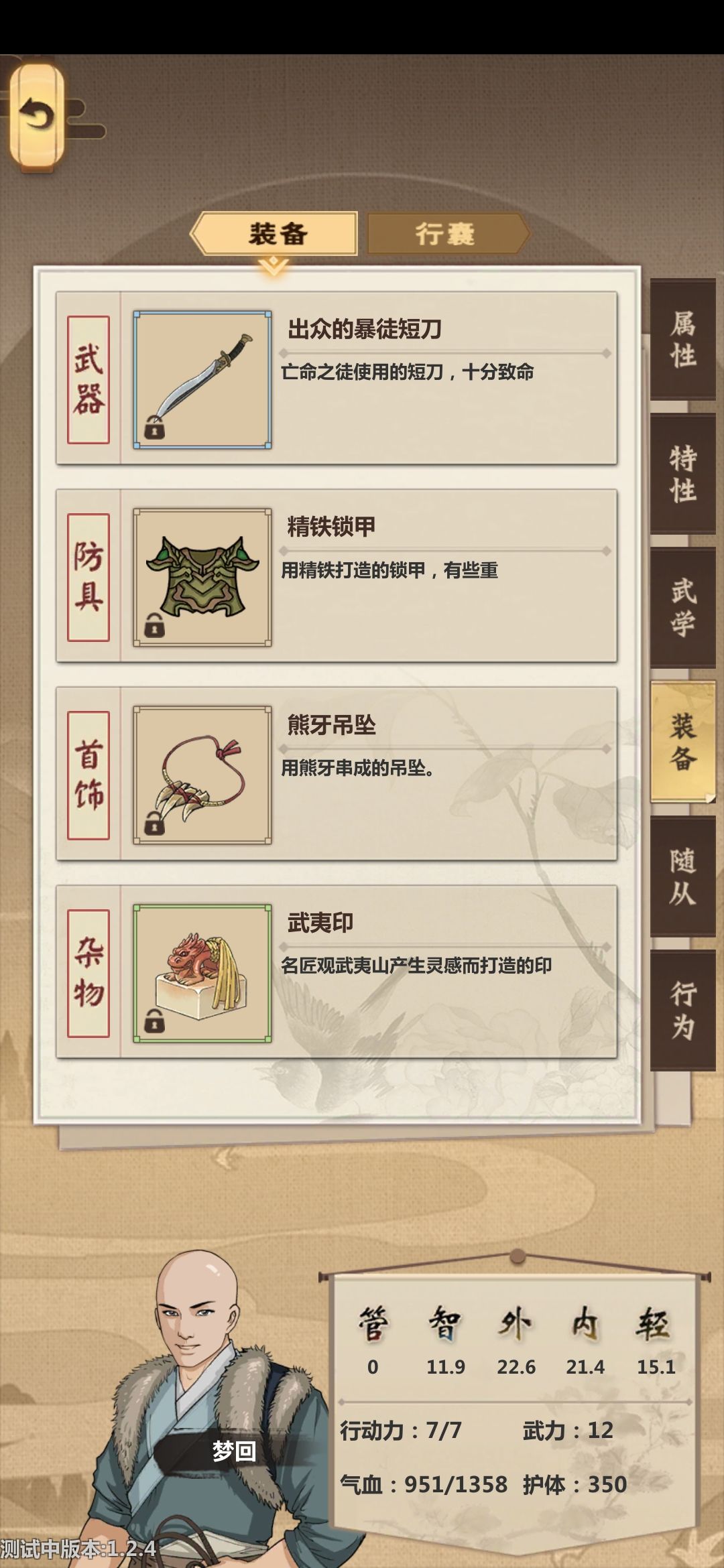 传承需求 怜星/力士 武夷印 剩下的自便 推荐三才(最强剑法没毛病吧) 矿(没矿你想要传承刷满?) 桃花(我愿称之为最强工具人) 身手敏捷(10%闪避和+1轻功 等回门派很多看着打不过的人就靠闪避多多sl过了) 白云腰带(5传承 便宜实惠加智力加内功 新手村都能用到的属性 如果富裕传承点 就点吧)也就是说 100+传承的人可以参考我的开局