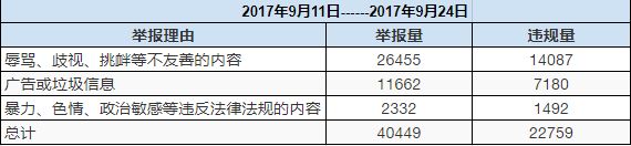 九月第3,4周的总举报量为40449条,实际处理量为22759条,举报成功率56.27%