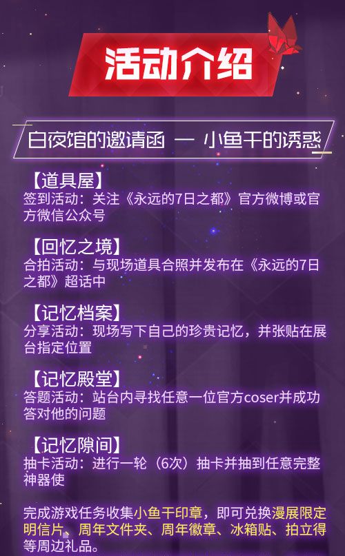 此次现场活也设置了许多趣味环节,白夜馆的黑猫猫正急需带走投喂小鱼干,完成以下活动环节:如同身临现实的「回忆之境」、留存着珍贵记忆的「记忆档案」、隐藏着稀有宝物的「记忆隙间」......即可获得黑猫·夜的信任,触发白夜馆主人的祝福礼包——漫展限定明信片、周年文件夹、周年徽章、冰箱贴、拍立得等周边礼品!