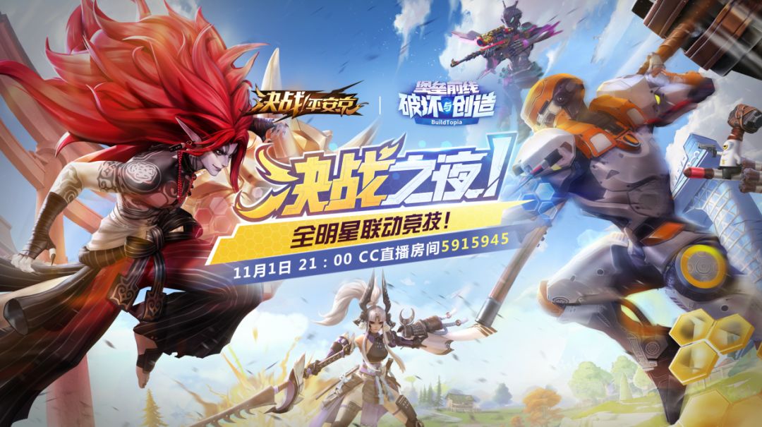 在11月1日晚上21:00,此次联动的重磅活动决战之夜就将在CC直播房间5915945正式打响!此次活动《堡垒前线》特别邀请了OPL四大全明星black、LUX.Ciri、LUX.Eureka、XROCK.xiaonan前来对战《堡垒前线》全明星沧笙、橙子、浩辰和暖阳。为了能让诸多探险家感受现场火热气氛,《堡垒前线》两大金牌主播枪炮和天元也将全程解说赛事细节,让探险家不错过每一个精彩瞬间!