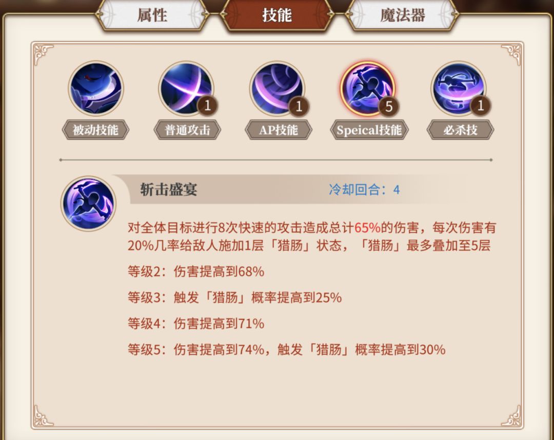 (但这个伤害是分散的,只有选定目标才受到5段伤害,5级技能主目标100%×2(可暴击)+5次20%连击伤害(无视防御)+5层流血200%伤害,