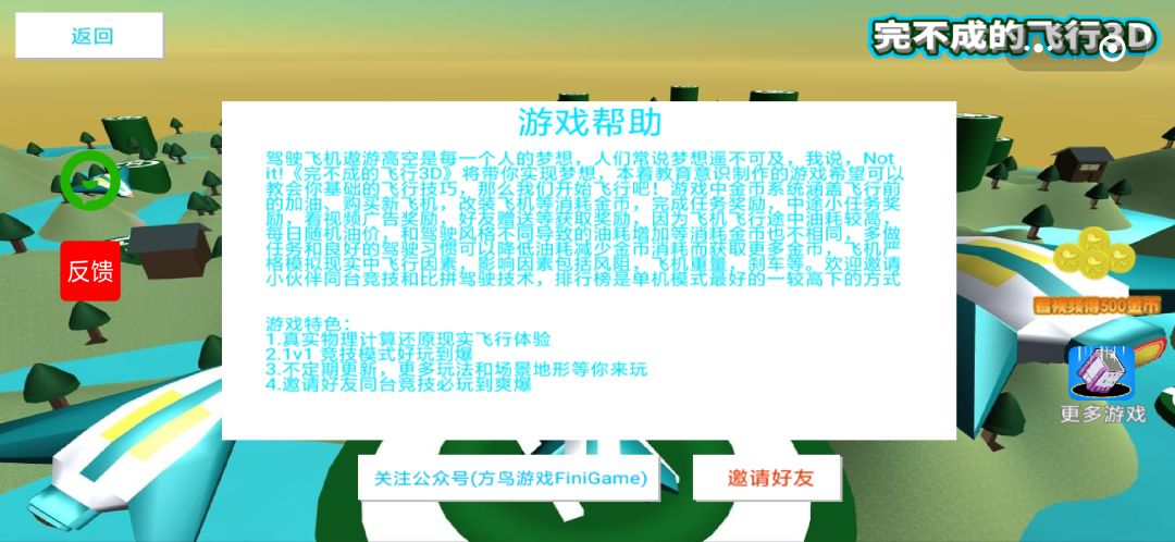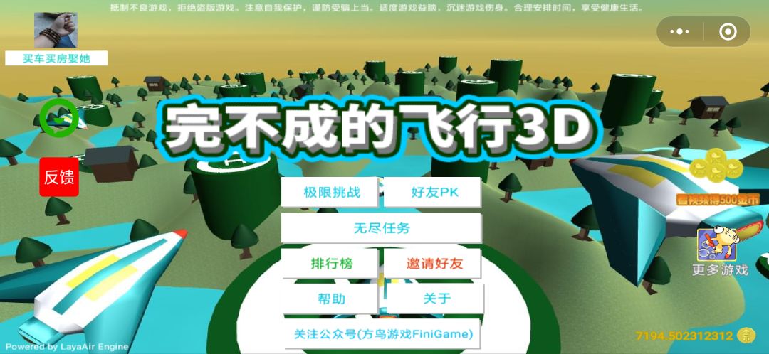 《完不成的飞行3D》开放预约啦,游戏进度可期,以下是测试视频,微信小游戏预计九月上线欢迎试玩!
