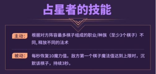 占星者的技能分为主动技能和被动技能,主动技能让她可以根据敌方阵容最多棋子组成的职业/种族(至少3个棋子)不同,释放不同的法术。多样的技能让占星者成为了场上的特殊存在,针对不同敌人的不同技能可以发挥意想不到的效果。